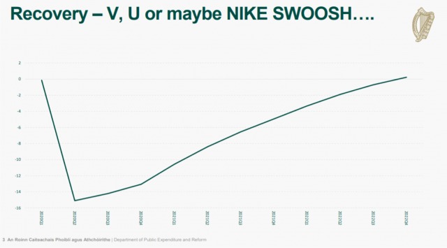 The big question is when can Ireland reopen for business? The short answer is nobody knows. It depends on the containment of the spread of the virus, both at home and abroad. Two letters of the alphabet are being used to suggest the rate of recovery, namely the letter ‘V’ and the letter ‘U’. Using the former letter, the suggestion is that there will be a V-shaped recovery, where the economy suffers a sharp but brief period of decline; followed by an equally rapid bounce back. That seems very optimistic. By contrast, the letter ‘U’ suggests a somewhat slower pace of recovery and one that is not very strong. In addressing an IIEA group meeting on 22 April 2020, Robert Watt, Secretary General of the Department of Public Expenditure and Reform, described a third possibility, called ‘Nike Swoosh’ which suggests a longer and slower recovery. Graph 1 reproduces this possible recovery leading up to the last quarter of the year 2022.