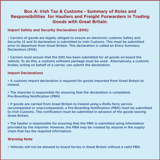 rt services within the Union. However, the two sides have agreed in the Treaty to recognise each other's ‘Authorised Economic Operators' programmes, enabling trusted traders that already benefit from this status to enjoy certain simplifications and/or facilitations relating to security and safety in their customs operations with the customs authorities of the other Party. But it is the truck drivers who have to do the ‘paperwork’, at the ports, mostly on their smart phones or tablets. To give a flavour of the ‘paperwork’, the Box A below summarises what the Irish Customs Authorities require from hauliers and freight forwarders for freight movements to and from Great Britain. Obviously, somewhat similar ‘paperwork’ is also required by the UK authorities for freight movements to and from Ireland – see the HMRC website for the latest information regarding the import and export requirements of the UK.