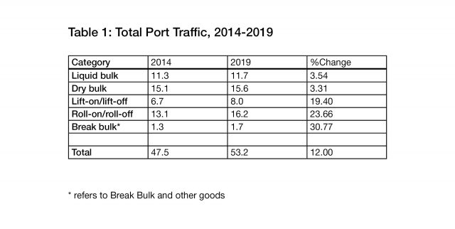 The overall total cargo of 53 million tonnes is made-up of five categories of traffic. This blog focuses on only two categories, namely Roll-on-Roll-off (RoRo) traffic and Lift-on-Lift-off (LoLo) traffic; these two categories are usually referred to as ‘Containerised Traffic’. The other three segments of total traffic, which are not embraced by this blog, are Liquid Bulk; Dry Bulk; and Break Bulk. Table 1 captures all five categories and show their performance between 2014 and 2019. Each component grew, but at different rates, over the five year period. Break bulk grew at the fastest rate, by over 30%; while liquid bulk and dry bulk both grew at rates of less than 4%. RoRo grew by nearly 24% and LoLo by nearly 20%.