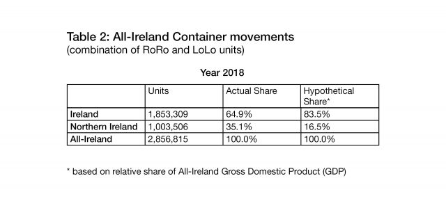 The foregoing table shows the volumes of RoRo and LoLo traffic directly traversing Irish ports. As well as these volumes, some additional cargo moves by air[iv] and some through ports in Northern Ireland. While detailed statistics are not available on cross-border trade, it is possible to calculate the flows by combining official container data for Northern Ireland with container data for the Republic of Ireland. The data are provided by the Central Statistics Office (for Republic of Ireland) and the Northern Ireland Statistics and Research Agency (for Northern Ireland Ports). The measure used for this comparative work is the number of ‘container units’ rather than ‘tonnage’. The numbers of containers measured are a combination of RoRo units and LoLo units for the year 2018. Table 2 shows that over 35.1% of all container movements (2.9 million) went through Northern Ireland ports in 2018, while Northern Ireland’s share of All-Ireland GDP was estimated at 16.5 percent. This is over twice the proportion that would be expected, using Gross Domestic Product (GDP) as a proxy measurement.