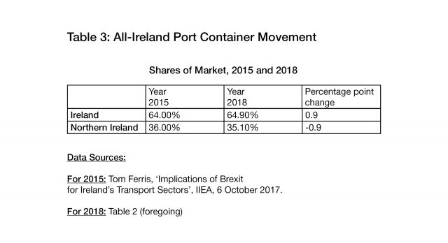 A question arises as to whether there has been a change in market shares for container movements since the result of the June 2016 UK Referendum signalled the prospect of the introduction of border procedures? The evidence shows, somewhat surprisingly, that there has been only a marginal change. An IIEA paper from 2017 had shown that 36% of all container movements went through Northern Ireland ports in 2015.[v] This is a reduction of less than 1 percentage point in the three year between the years 2015 and 2018. It might well be that more recent data, for 2019 and 2020, will show more significant changes in market shares. Table 3 shows the data for 2015 and 2018.