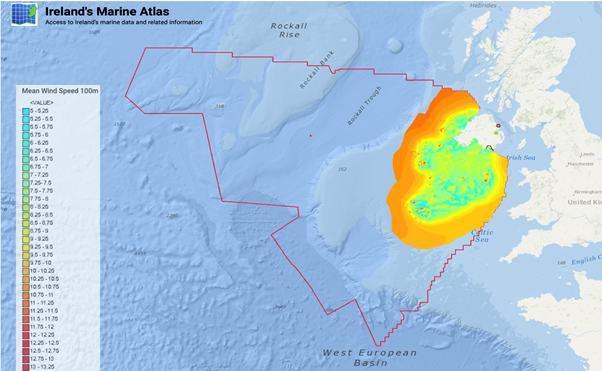 The shades of yellow and orange off the coast of Ireland indicate mean wind speed. The key in the slide shows that the darker the colour of orange, the faster the average wind. The slide shows that the wind resource is greatest off the West/North-West coast of Ireland making this region the most opportune for floating wind farm development.