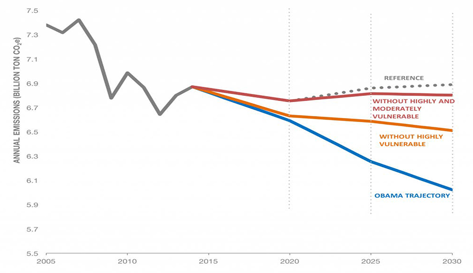As can be seen (Fig 1), the 605 Mt estimate only accounts from reduction at stake in the period to 2030 – who knows how long it would take the US to get back on a decarbonisation pathway if all Obama-era regulations are rescinded?