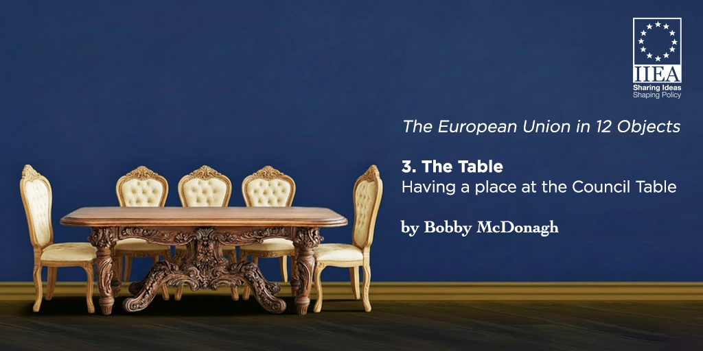 A table is, of course, often similarly required, in practical terms, as a piece of furniture in each of the EU institutions and beyond. However, the very definition of the Council is the “table”, the negotiating table, around which the Member States sit. The Council has no alternative to taking its decisions and formulating its policies around such a table. When reference is made to “having a place at the table” in Europe, it is normally the Council that is being referred to. That is why I have chosen a table to symbolise the Council.