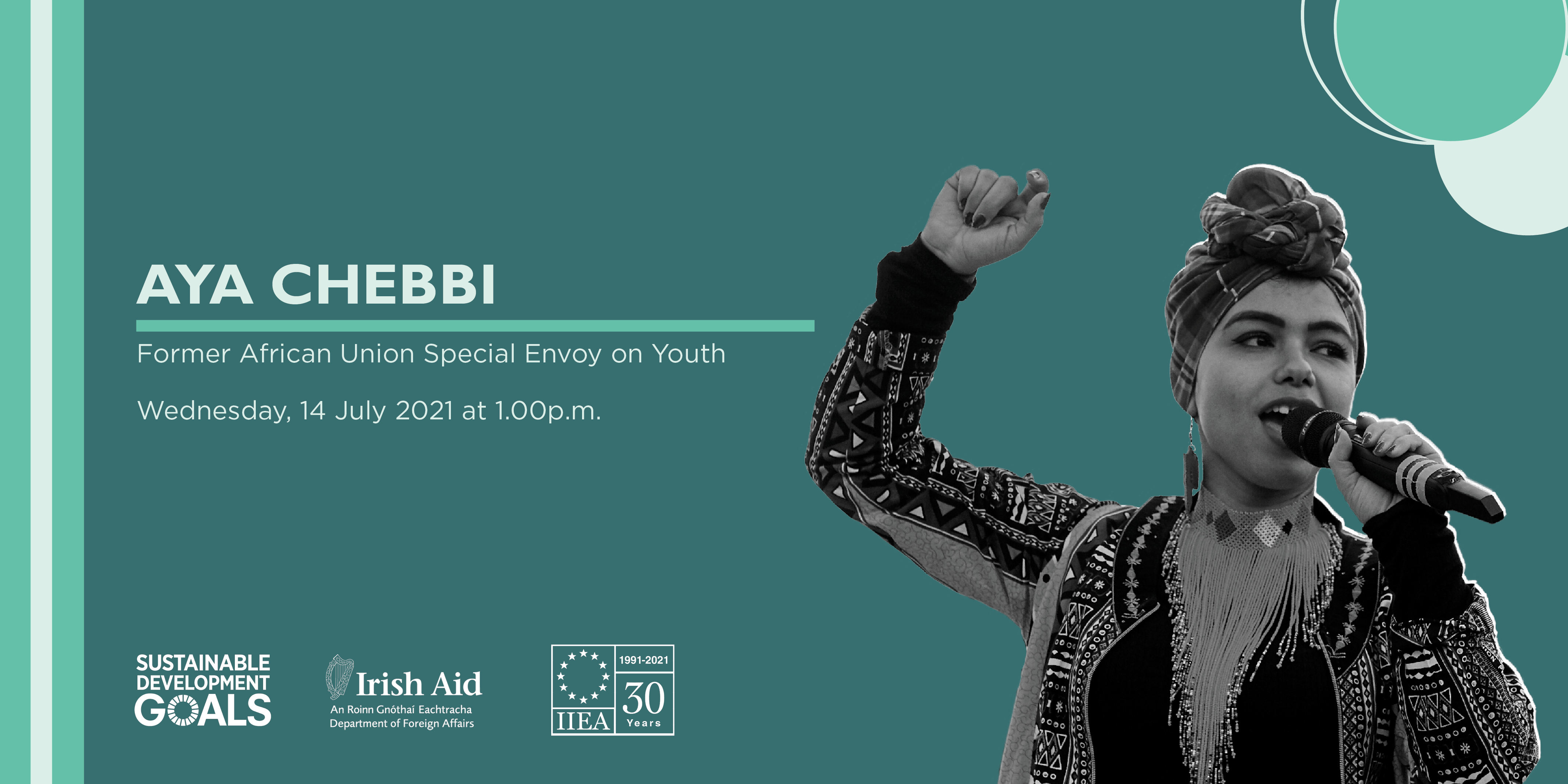In the fourth webinar of the 2021 Development Matters lecture series, which is supported by Irish Aid, the IIEA welcomed Ms Aya Chebbi to speak on intergenerational co-leadership and youth agency with respect to achieving the Sustainable Development Goals (SDGs). Aya Chebbi is the former and first African Union (AU) Special Envoy on Youth and is the Chair of the Nala Feminist Collective.
