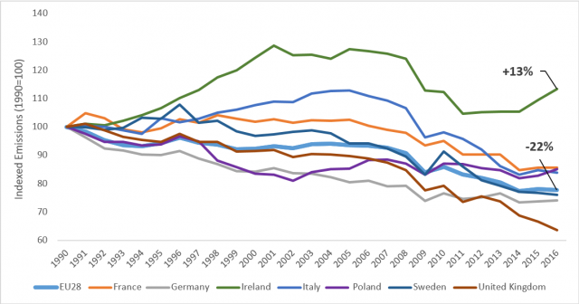 The wider context for his remarks is Ireland’s lacklustre climate performance over several decades. Since we have become unequivocally aware that climate change will cause severe, widespread and irreversible damage to lives, livelihoods and the natural environment in about 1990, the EU has managed to reduce emissions by 22%. By contrast, Ireland’s emissions have increased 13% (Fig 1). While our European partners have been getting on with the hard work of decarbonisation, successive Governments have failed to show much interest at home, while touting “Irish leadership” to our EU and UN partners.