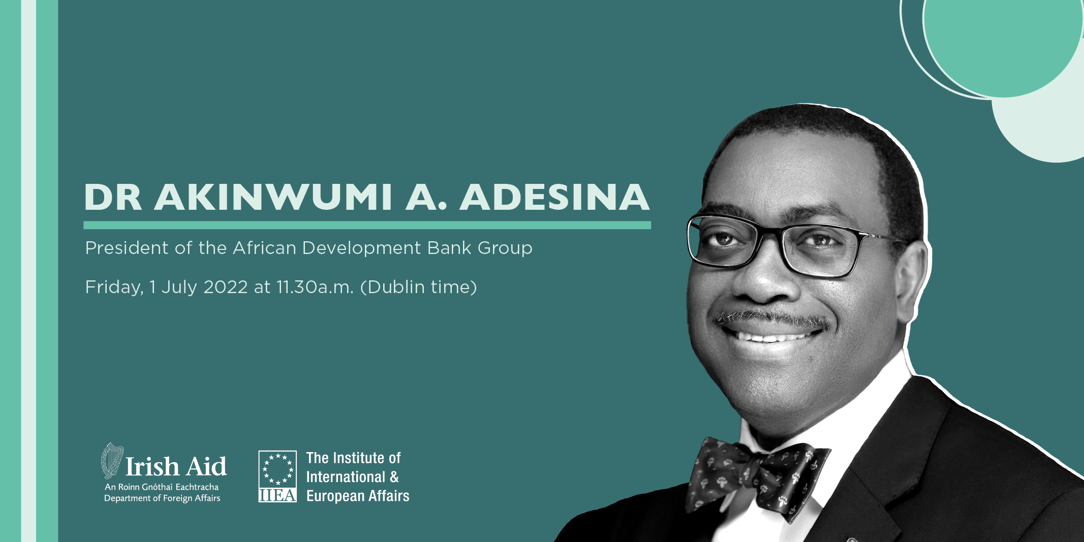About the Speaker: Often described as “Africa’s Optimist-in-Chief”, African Development Bank Group President Dr Akinwumi A. Adesina is widely lauded for his visionary leadership and passion for Africa’s transformation. Dr Adesina was first elected President of the African Development Bank Group in 2015 and was unanimously re-elected for a second five-year term in 2020. A former Nigerian Minister for Agriculture, in 2017, Dr Adesina was conferred with the World Food Prize, also known as the “Nobel Prize for Agriculture”. With Dr Adesina at the helm, the African Development Bank Group achieved the highest capital increase since its establishment in 1964 and responded boldly and swiftly to the COVID-19 pandemic. Ireland joined the African Development Fund and the African Development Bank in 2020.